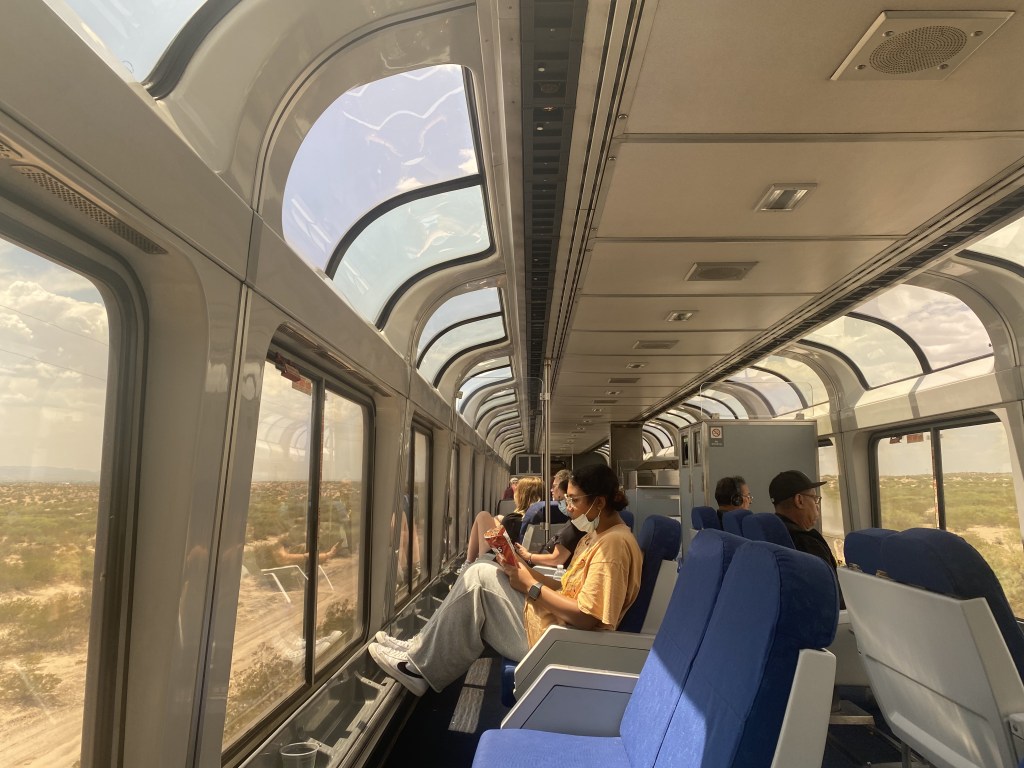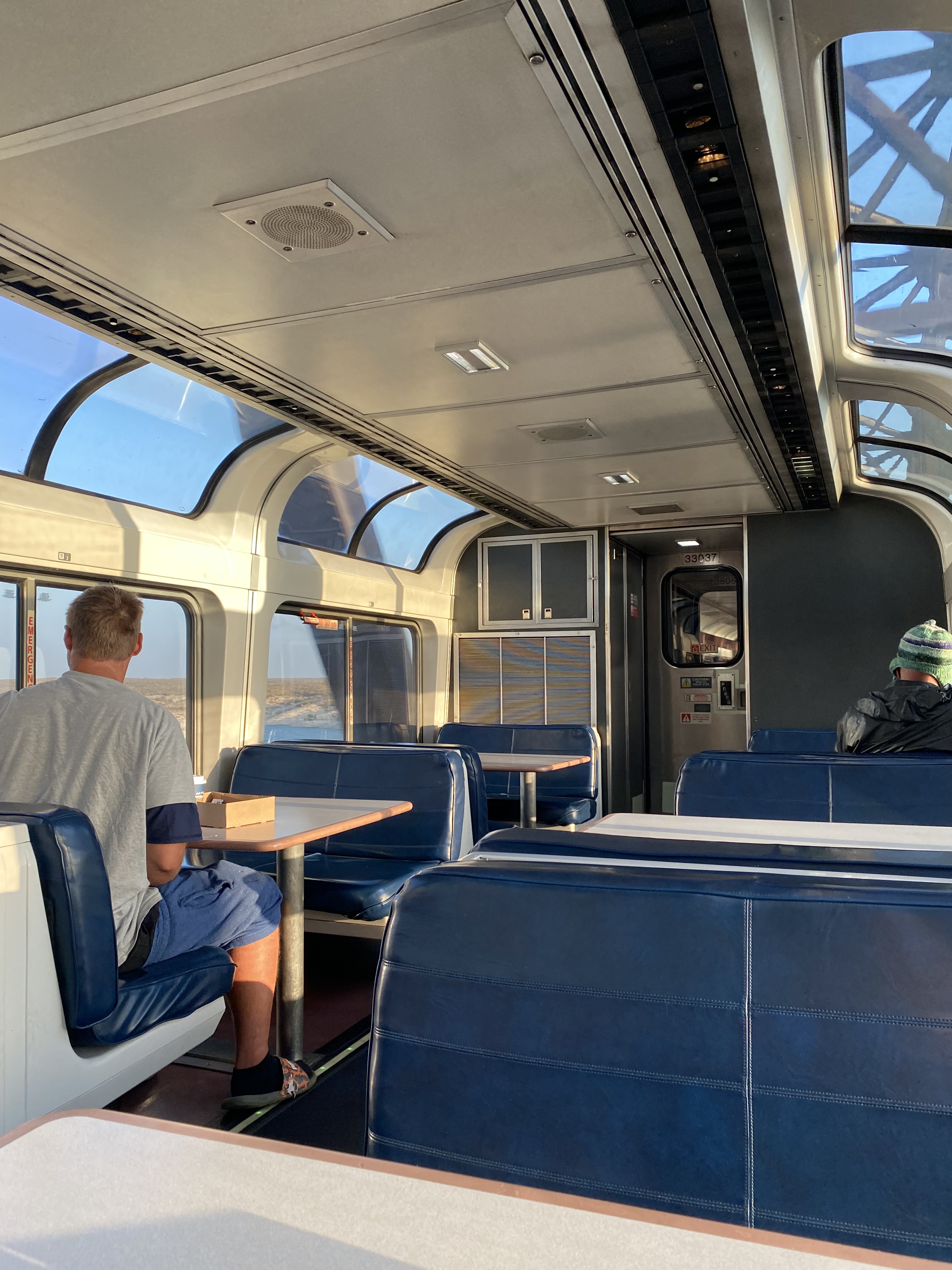 Ahh, the romance of train travel. Reclined, relaxed, renewing oneself while gazing lazily at the world through the picture window.